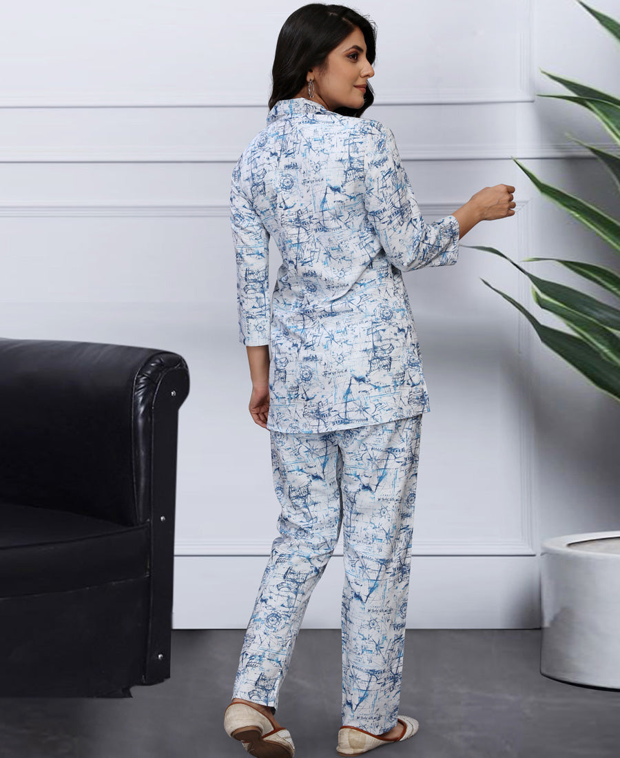 Asthetic White And Blue Color Geometric Printed Co-Ord Set