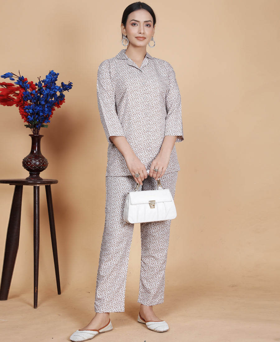 This classy co-ord set is perfect for casual outings, featuring an alluring print that adds a stylish flair. Crafted from soft, breathable Twil Cotton, it ensures comfort throughout the day. The bottoms come with a convenient pocket, combining practicality with effortless elegance. A touch of personality in every detail makes this set a must-have for your laid-back yet refined wardrobe.
