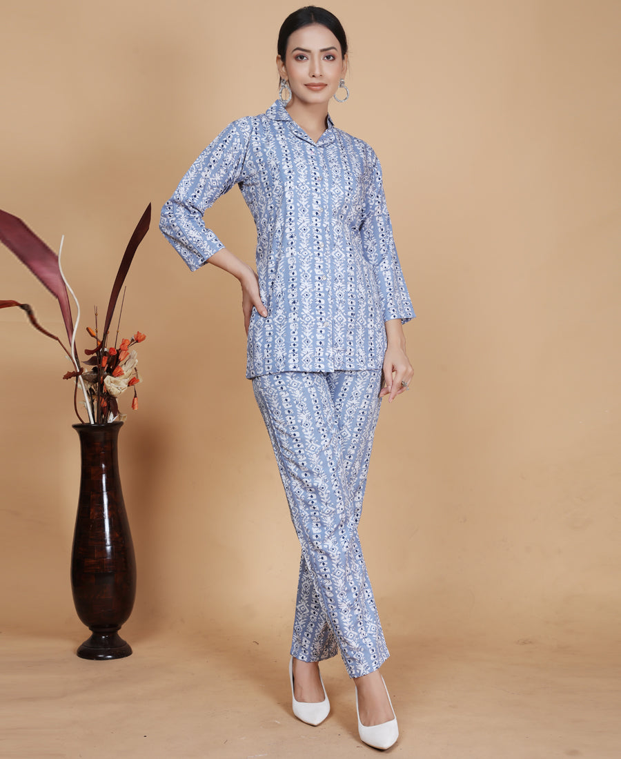 Beautiful Sky Blue Color Floral Printed Co-Ord Set
