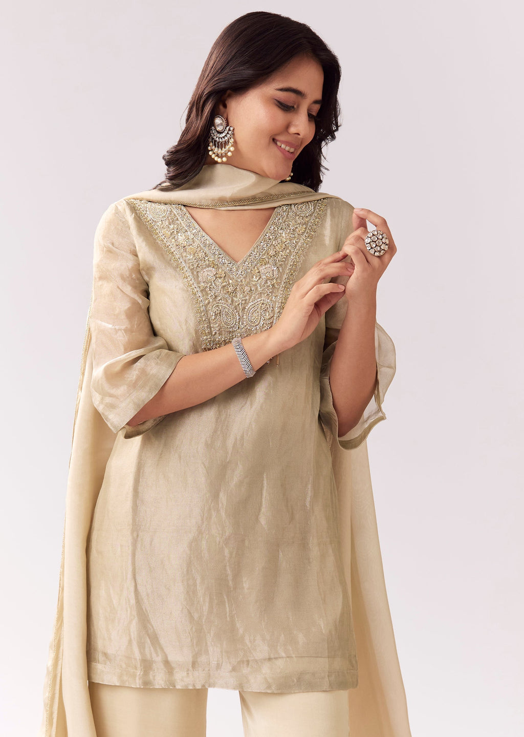 This beige palazzo suit is perfect for those who want festive shimmer in a softer tone. Tissue and crepe fabrics keep the outfit flowy yet elevated, while sequins and cut-dana work add sparkle. Flared sleeves create a statement silhouette, making it a strong pick for sangeet, mehendi, and reception looks. Includes palazzo and dupatta for a complete outfit. Awarded as the Most Trusted Brand, we're delivering styles you love, just as promised.