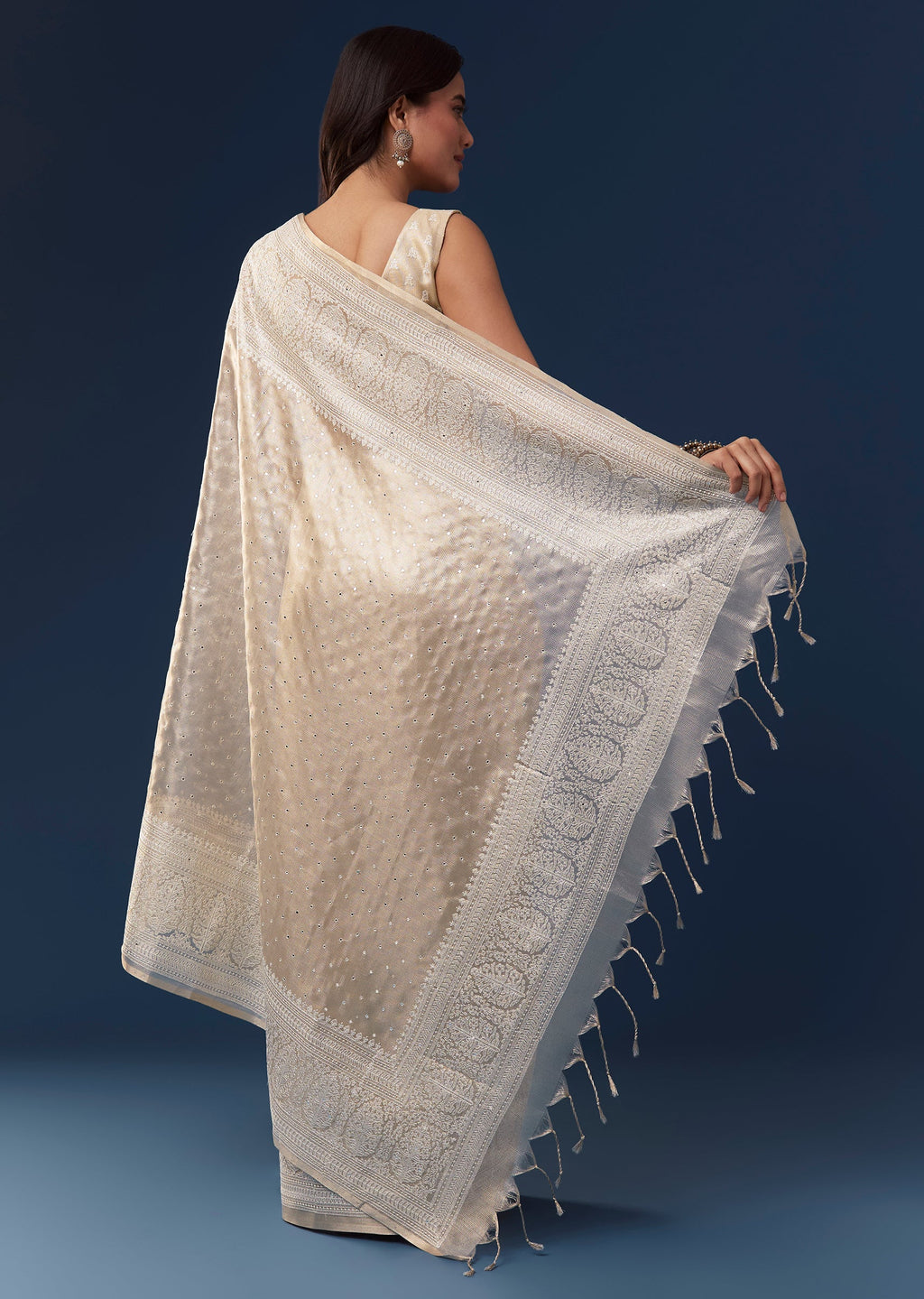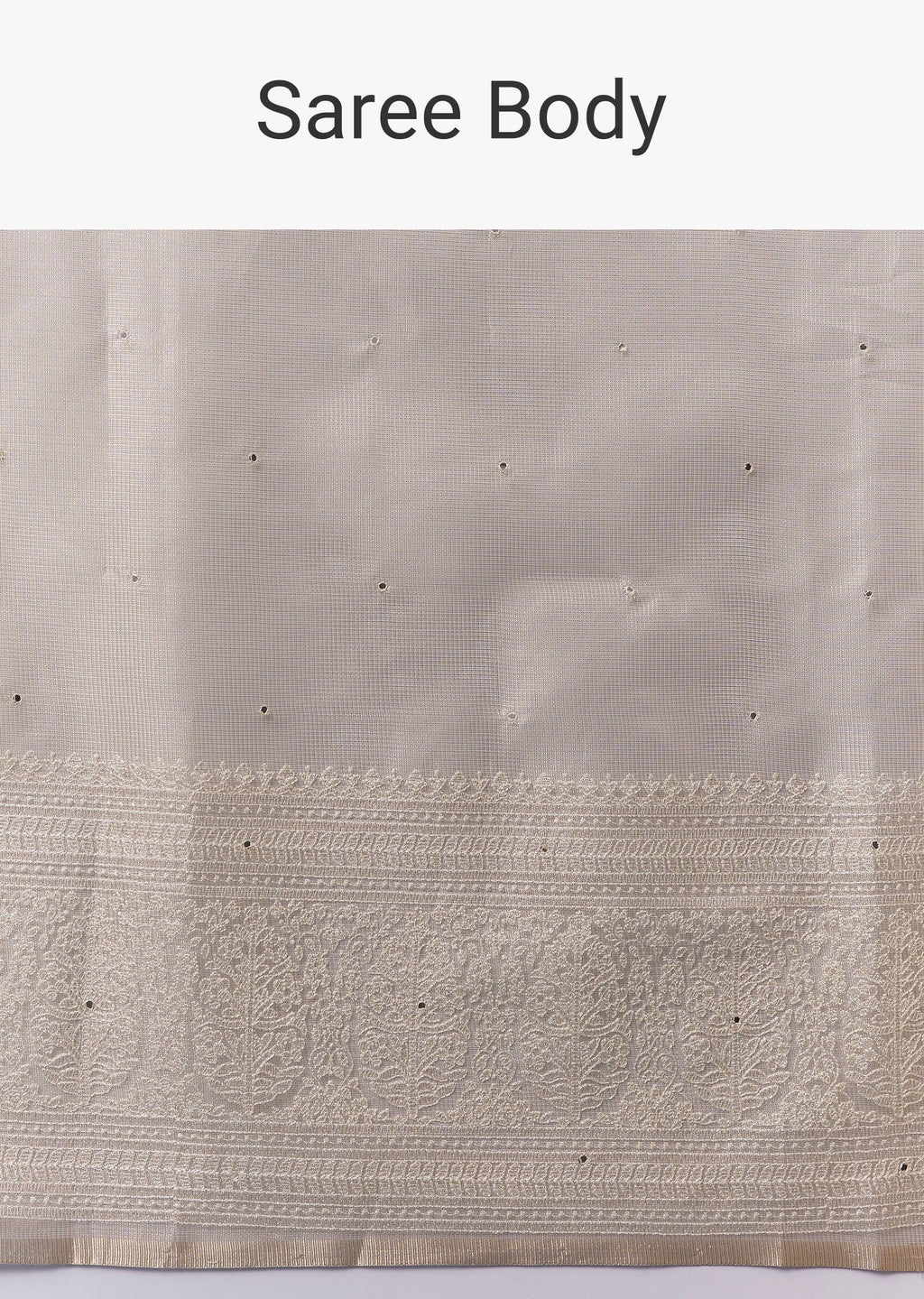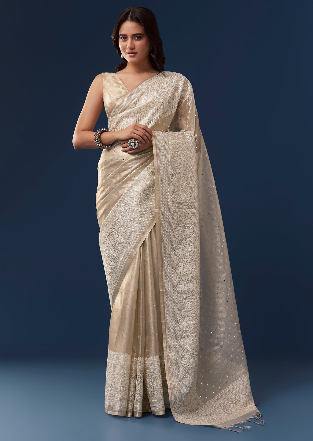 This light beige tissue saree exudes casual elegance with its subtle shine and soft drape. The broad border is intricately embroidered with resham thread while mirror work is scattered all over, adding a delicate shimmer and artistic appeal. It comes with an unstitched embroidered blouse allowing you to tailor it to your preferred style for a graceful and versatile look. Awarded as the Most Trusted Brand, we're delivering styles you love, just as promised.