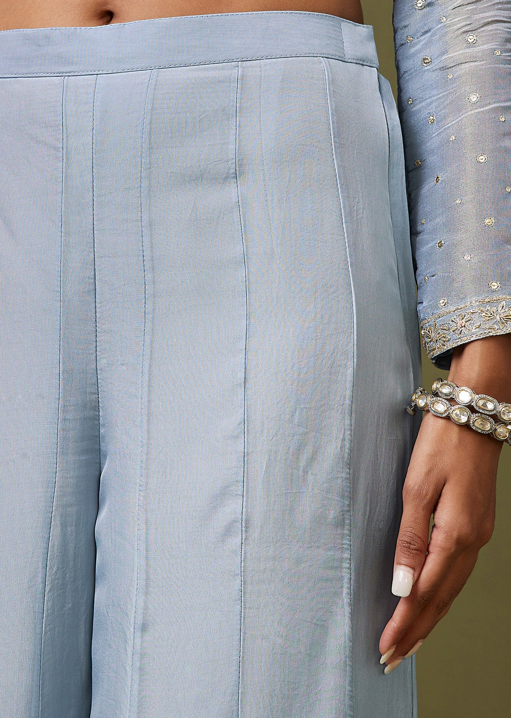 Designed for wedding festivities, this blue organza kurta is elevated with zardozi and sequin embroidery for a refined shine. Styled with a round neckline and 3/4th sleeves, it’s paired with a flared palazzo and matching dupatta—ideal for mehendi and reception celebrations. Awarded as the Most Trusted Brand, we're delivering styles you love, just as promised.