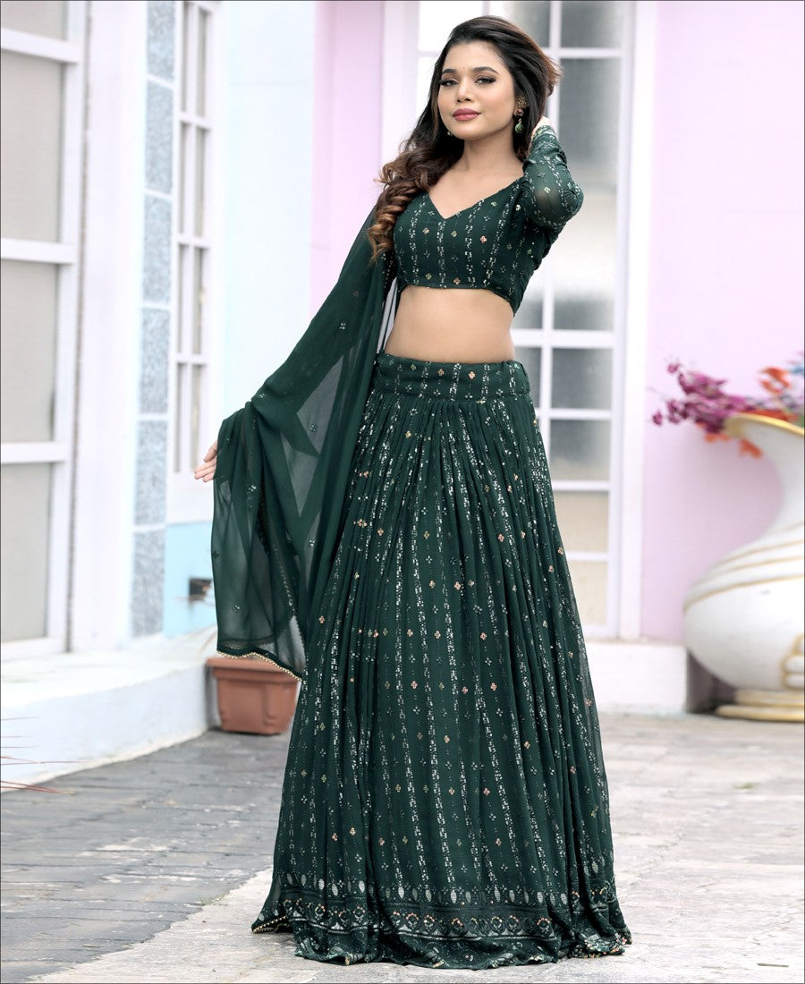 Transform in an instant into an icon of elegance with this bottle green colored lehenga. the lehenga is beautified with sequence work which is eye catching. this semi-stitched georgette lehenga comes along with unstitched blouse and georgette dupatta, women can buy this suit to wear for their upcoming functions, festivals, parties, event and occasions, where you want to be center of attraction. team it with stylish accessories to make your looks more beautiful. this attractive suit will surely fetch you compliments for your rich sense of style.measurement : to 3 to 3.25 meter lehenga flair,2.3 meter dupatta, 1 meter blouse,waist - up to 40' to 42'.