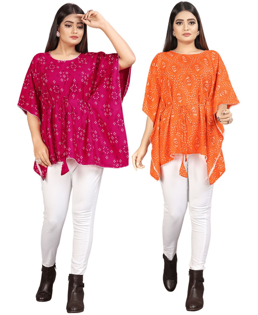 You will be the center of attention in this Pack of 2 Kaftan. Beautified with Bandhani Print work adds a sign of elegance statement with your look. This frees size stitched dress is made by cotton. Team it with stylish accessories to make your looks more beautiful. This attractive Kaftan dress will surely fetch you compliments for your rich sense of style.
