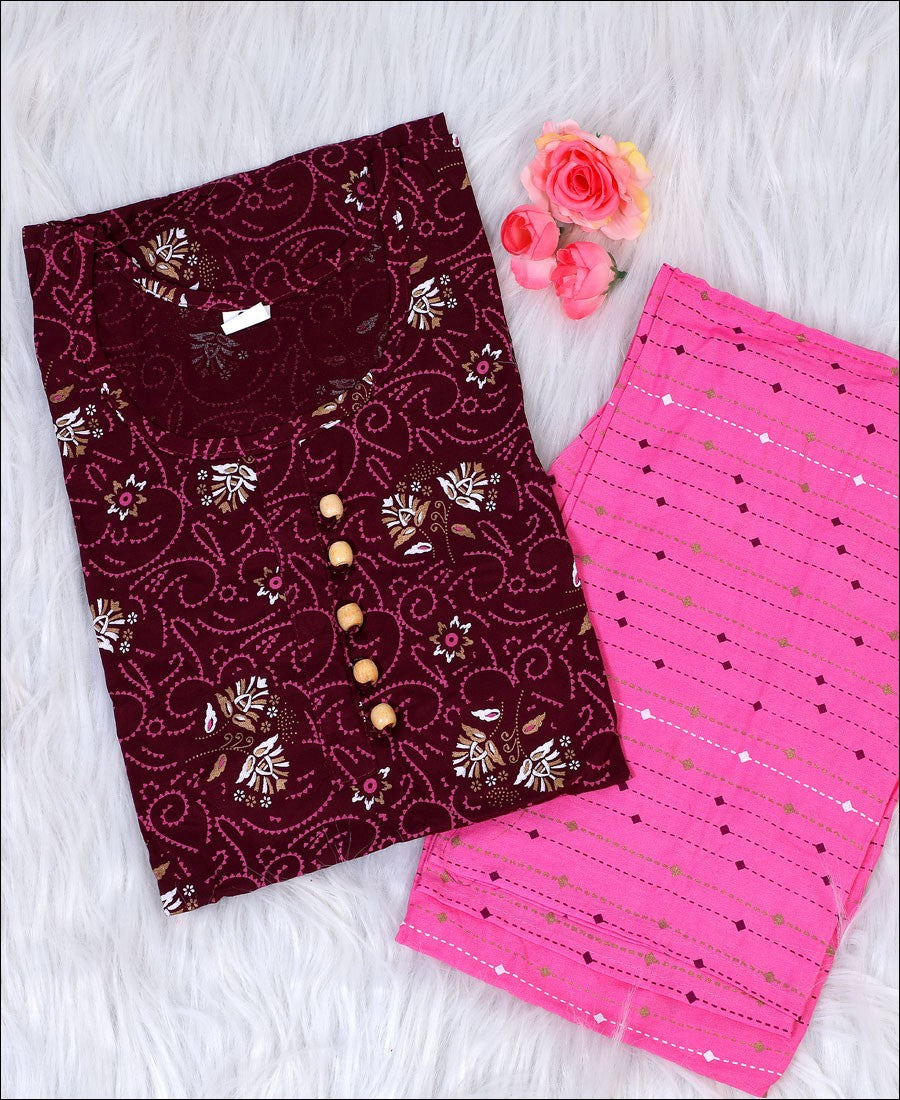 Look ravel and stylish in this Wine color Kurti Beautified with Block Print. Readymade Kurti comes with a Top & Bottom. This stitched kurti is perfect to pick for party, weekend get-together, kitty parties and events. Pair it up with leggings, cigarette pants to create a contrasting effect, along with heels & stylish accessories.