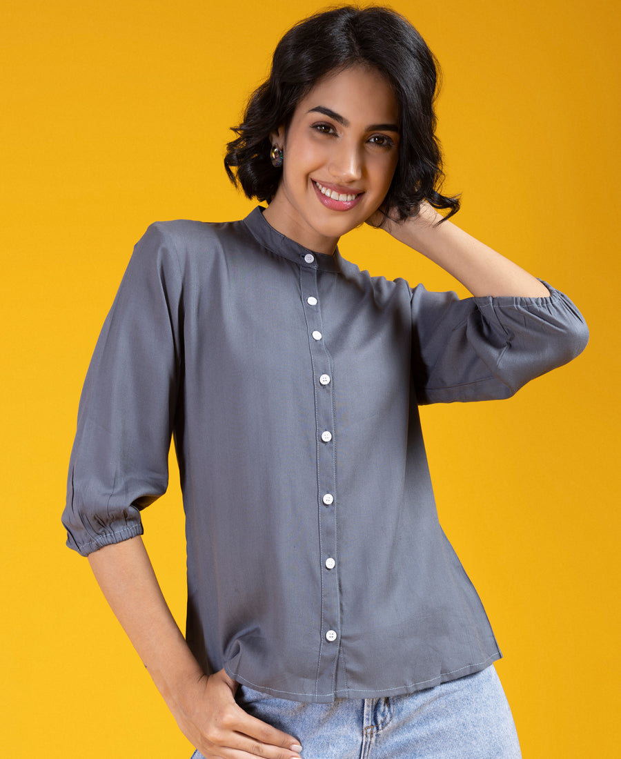 Step into subtle sophistication with this glamorous plain shirt, tailored in breathable woven cotton for all-day comfort. Designed with a sleek mandarin collar and soft puff sleeves, this shirt-style top brings a refined charm to your everyday wardrobe. Its neutral tone makes it a versatile staple, effortlessly transitioning from office wear to relaxed evening outings.