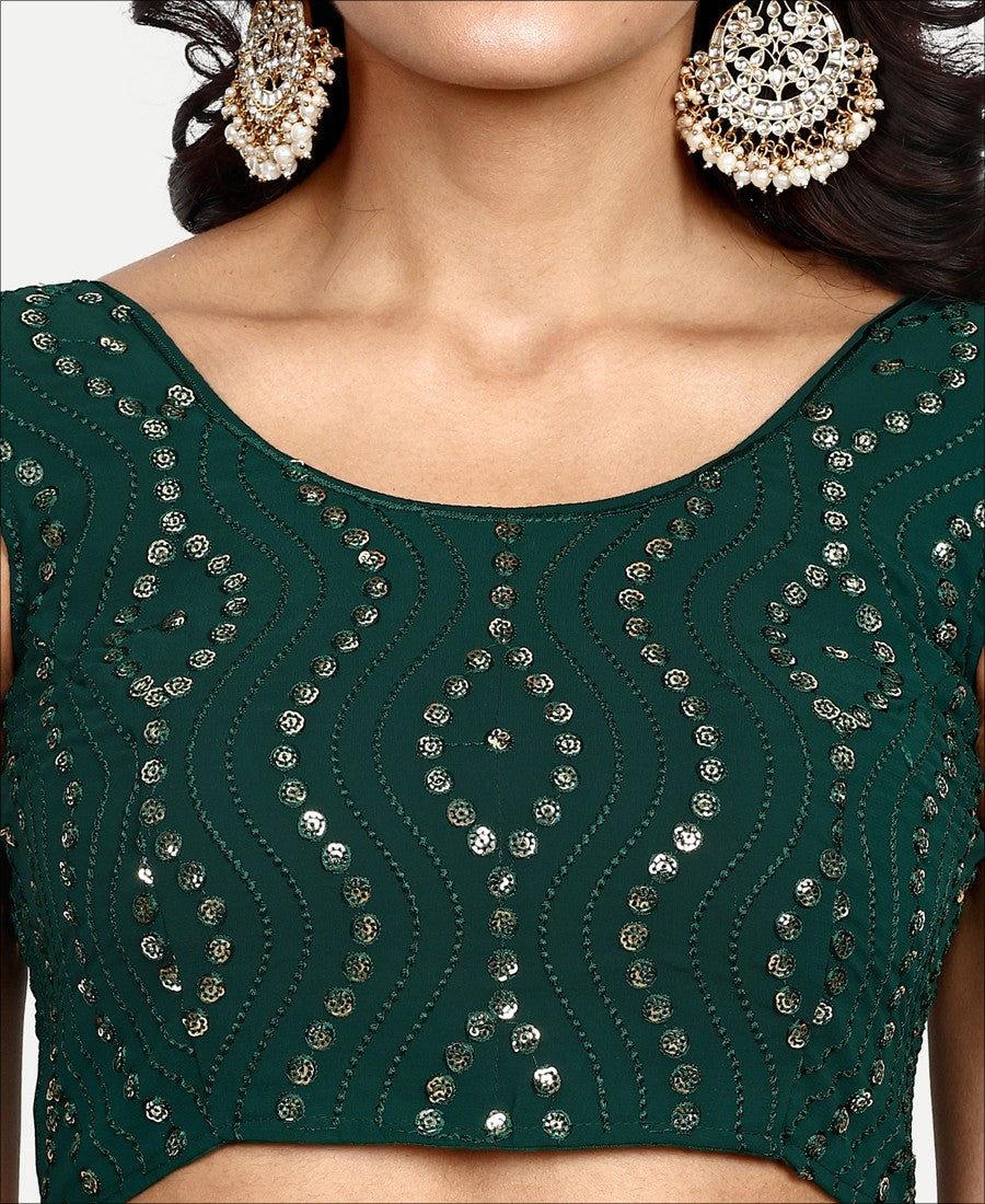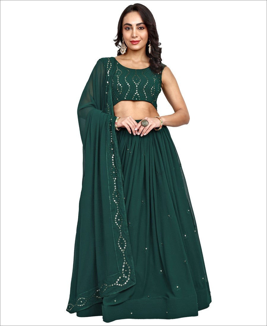 Everyone will admire you when you wear this Bring Back the traditional charm to your closet with this exceptional green color lehenga choli. The semi-stitched lehenga is made of georgette fabric accompanied with unstitched georgette fabric blouse piece and georgette fabric border work dupatta. Women can buy this lehenga choli to wear for their functions, festivals, wedding functions or engagement ceremonies and occasions, where you want to be center of attraction. Team it with traditional accessories to make your looks more beautiful. Buy this lehenga choli and earn lots of compliments from onlookers.measurement : 3 meter lehenga flair,2 meter dupatta, 0.80 meter blouse,waist - up to 40'.