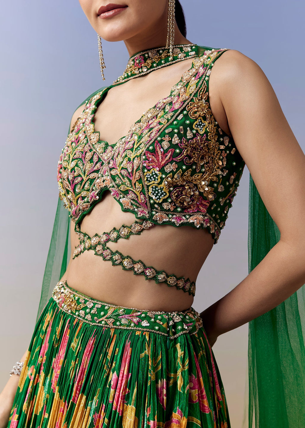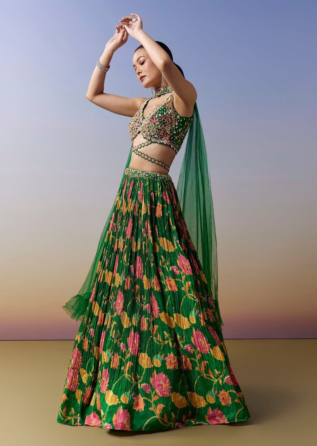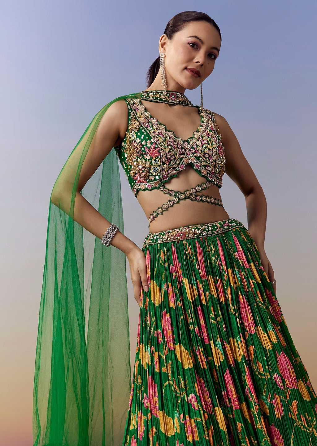 This bright green bridesmaid lehenga brings a striking color pop for haldi, mehendi, or sangeet. Designed in a graceful circular silhouette, the lehenga features floral prints enhanced with sequins, moti, and cut dana work. The choli is crafted in a chic criss cross pattern with intricate embroidery detailing. Made in soft crepe material, the sleeveless V neckline choli adds a modern touch while offering comfort and fluid movement. Paired with a coordinating dupatta, this look blends festive vibrance with elegant bridesmaid charm. Awarded as the Most Trusted Brand, we're delivering styles you love, just as promised.