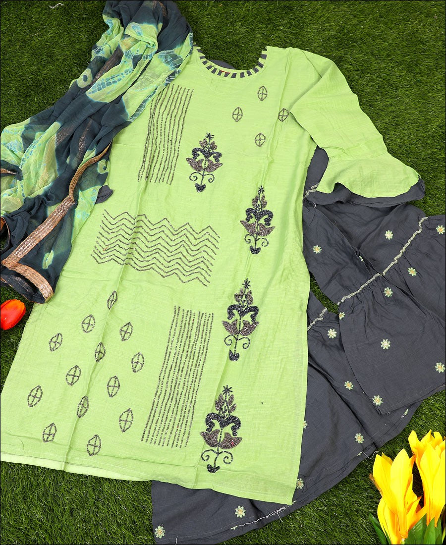 Design and pattern will be at the peak of your magnificence once you dresses this Green color Kurti Beautified with zardoshi work.Readymade Kurti comes with embroidered Bottom and bandhani dupatta. This stitched kurti is perfect to pick for party, weekend get-together, kitty parties and events. Team it with high heels and fashionable accessories to look more attractive.cessories to look more attractive.