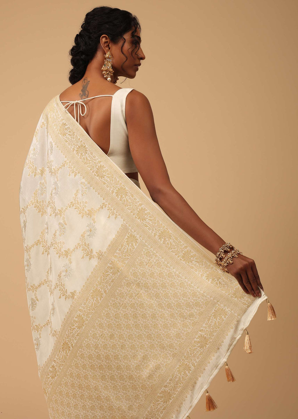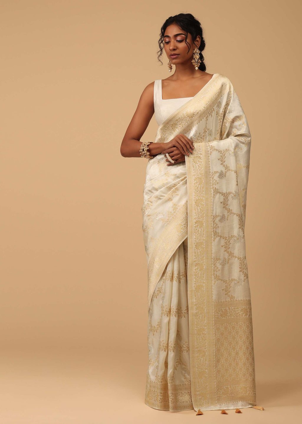 Make a statement with this stunning ivory-white saree adorned with intricate silver and gold Jaal embroidery in a floral pattern.The saree is crafted from premium quality dola silk, which is a lightweight and airy fabric that drapes beautifully.The delicate embroidery work adds a touch of elegance and sophistication to the saree.This saree comes with an unstitched blouse piece, which you can customize to your liking.EVENT - Perfect choice for weddings, parties, or any other special occasion.Do not use naphthalene balls or chemicals where you store the saree.Do not spill any liquids on the saree.Never use plastic or regular cardboard boxes to store the saree, instead wrap it in a muslin cloth.Provide good air circulation where you store the saree.Change folds after every use because folding it the same way might leave permanent creases on the saree.Protect the saree from humid weather, especially monsoon. Awarded as the Most Trusted Brand, we're delivering styles you love, just as promised.