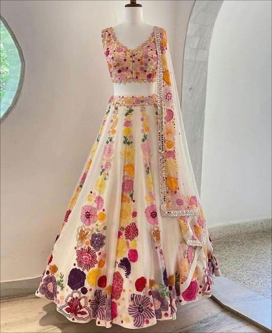 Pamper the women in you with this cream colored lehenga choli. Beautified with amazing sequence embroidery and thread work within the attire adds a sign of elegance statement with your look. The semi-stitched lehenga is made of georgette fabric accompanied with embroidered georgette fabric blouse piece and georgette dupatta. Women can buy this lehenga choli to wear for their functions, festivals, wedding functions or engagement ceremonies and occasions, where you want to be center of attraction. Team it with traditional accessories to make your looks more beautiful. Buy this lehenga choli and earn lots of compliments from onlookers. Measurement : Nearly 3 meter lehenga flair, 2.25 meter dupatta, 0.80 meter blouse, lehenga length 42', waist upto 42'.