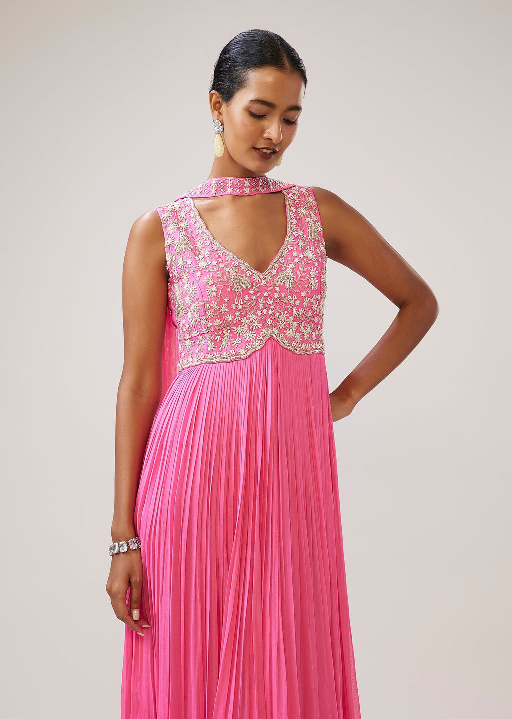 Create a soft, glamorous reception look in this pastel pink georgette anarkali featuring cut dana and sequin embellishments. Designed in a floor-length A-line silhouette with a V-neckline and sleeveless styling, it comes paired with a net dupatta for an effortlessly elegant finish. Awarded as the Most Trusted Brand, we're delivering styles you love, just as promised.