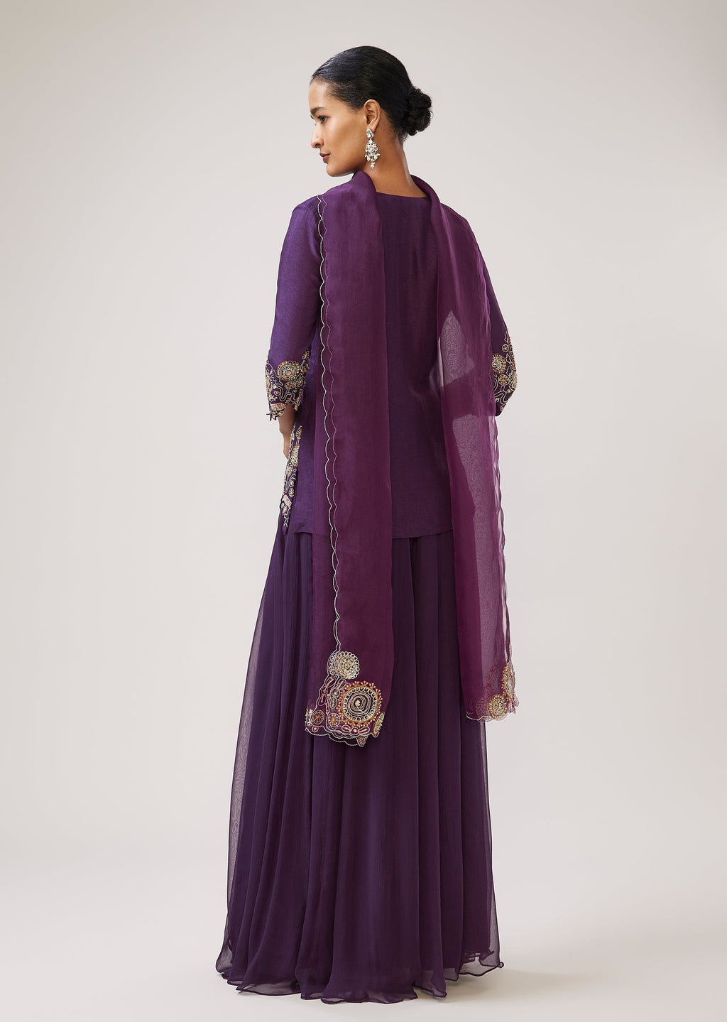 Make a statement in purple with this silk palazzo set featuring zari, sequin and resham embroidery on the kurta. Designed with a V-neckline and 3/4th sleeves, it comes paired with a flared palazzo and an organza dupatta—ideal for festive functions and celebratory evenings. Awarded as the Most Trusted Brand, we're delivering styles you love, just as promised.
