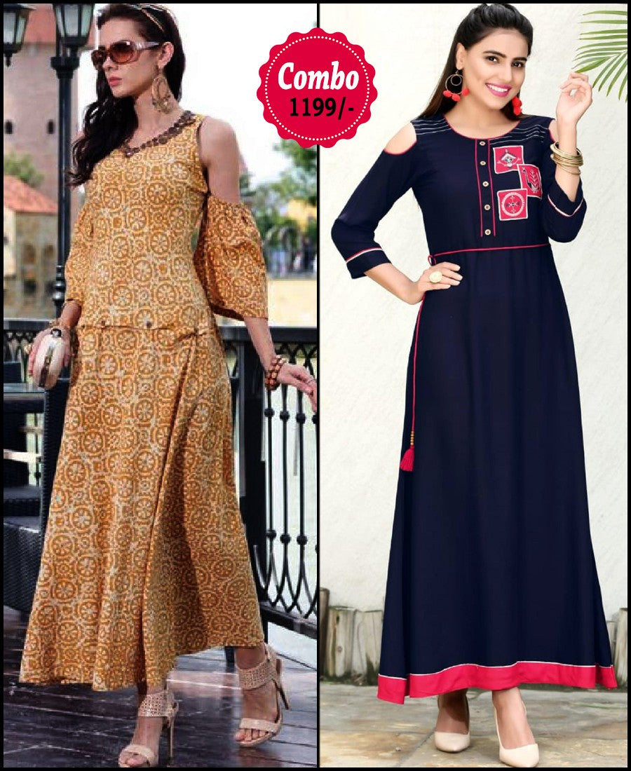 RE - Elegant navy blue and multi color rayon print stitched kurti - Pack of 2