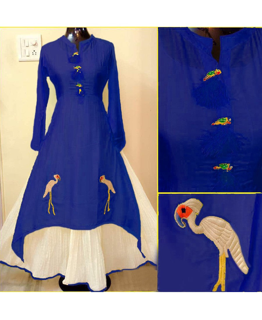Look subtle and stylish in this Blue Chanderi Cotton designer wear semi-stitched ladies kurti. Adorned gracefully with fancy Fumka and embroidery work. Pair the kurti with Contrast white color Scut to complete the look. The kurti is customize upto 44'.