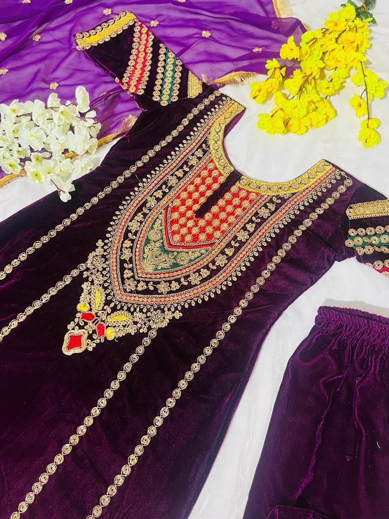 Flaunt a new ethnic look with this charming wine colored sharara suit. This 9000 velvet suit is beautifully adorned with embroidered work comes along with velvet bottom and faux georgette dupatta which makes it appear more adorning. Women can buy this suit to wear for their upcoming festivals, homely functions, parties, kitties, weekend get together. Get this unstitched suit stitched according to your fit and comfort. Team it with stylish accessories to make your looks more beautiful.Measurement : Top Details : Top Length : 41 inch,Top Bust Size : Free (Up to 44 Inch), Bottom Details :Stitched Bottom Waist Up to 44 inch, Dupatta Details : 2.2 mtr.