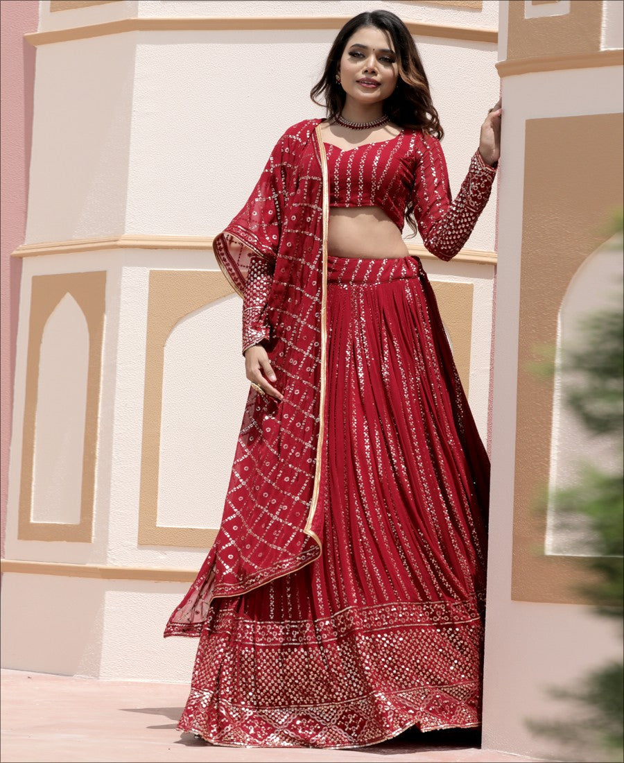 Give your vibrant highlight to your ethnic attire with this deep red colored lehenga choli.Beautified with amazing sequence work within the attire adds a sign of elegance statement with your look.The semi-stitched lehenga is made of georgette fabric accompanied with unstitched blouse piece and georgette dupatta.Women can buy this lehenga choli to wear for their functions, festivals, wedding functions or engagement ceremonies and occasions where you want to be center of attraction Measurement : Nearly 3 to 3.25 meter lehenga flair, 2.25 meter dupatta, 1 meter blouse, lehenga length 42', waist upto 42'. .