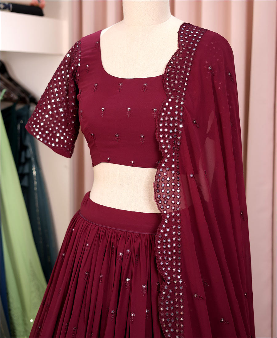You will be the center of attention in this attire. Pamper the women in you with this Wine Berry colored lehenga choli. Beautified with amazing thread embroidery with sequence Work within the attire adds a sign of elegance statement with your look. The semi-stitched lehenga is made of faux georgette fabric accompanied with sequence Work faux georgette fabric blouse piece and faux georgette dupatta. Women can buy this lehenga choli to wear for their functions, festivals, wedding functions or engagement ceremonies and occasions, where you want to be center of attraction. Team it with traditional accessories to make your looks more beautiful. Buy this lehenga choli and earn lots of compliments from onlookers. Measurement : Nearly 3.5 to 4 meter lehenga flair, 2.25 meter dupatta, 0.80 meter blouse, lehenga length 42', waist upto 42'.